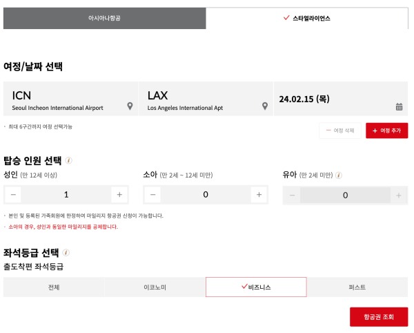 아시아나 스타얼라이언스 마일리지 항공권 예약하기