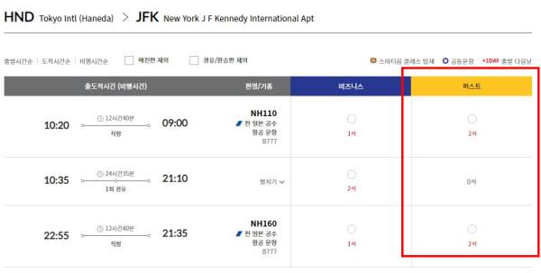 위의 이미지처럼 일반 항공권을 조회했을 때 조회되는 날짜까지 마일리지 항공권 예약이 가능합니다. 이렇게 하면 아나항공의 퍼스트 클래스도 예약이 가능합니다. 물론 빠른손이 필요합니다.