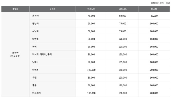출발지 한국(동북아) 기준 왕복 스타얼라이언스 마일리지 항공권 공제표입니다. 우리나라에서 비지니스를 이용해서 유럽, 북미로 가는 편도 는 60,000마일리지입니다. 공제표 상의 지역구분은 일반적으로 생각하시면 되고, 중미, 남미1, 남미2만 구분해서 보면 됩니다.